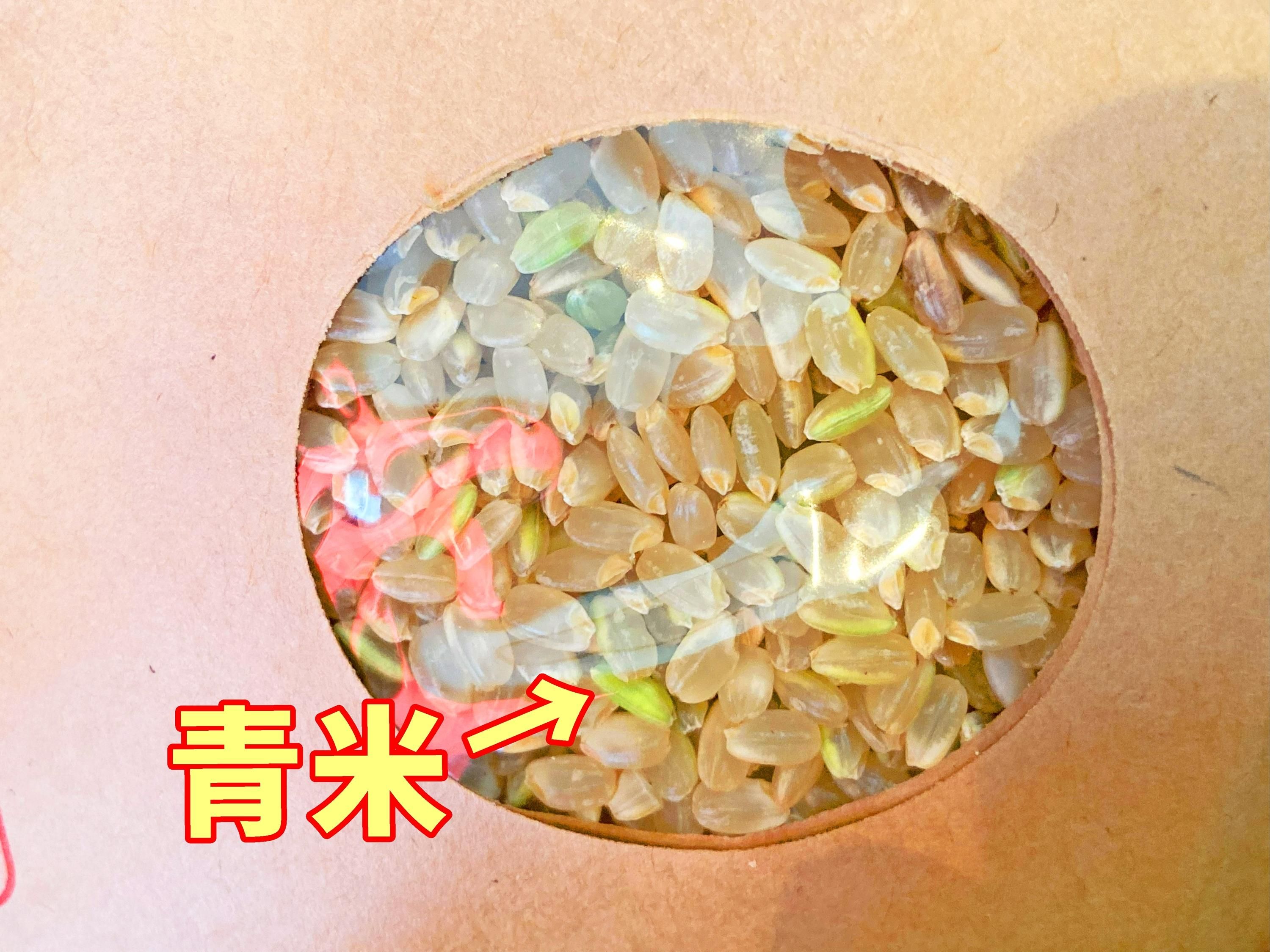 届いたピカピカの新米玄米袋の窓からは、収穫期好適米の証「青米」も確認できます。さすが章さん、暑い暑い8月の稲刈りも、農家としてやるべきことをキッチリやってくれました。