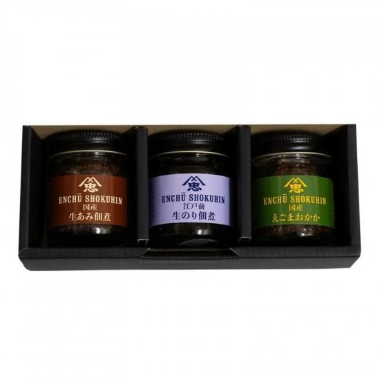 その遠忠食品から、あひるの家でもダントツ人気の【江戸前生のり佃煮】と【国産えごまおかか】【国産生あみ佃煮】のプチサイズの佃煮3本が化粧箱に入ったギフトセットが登場しました。