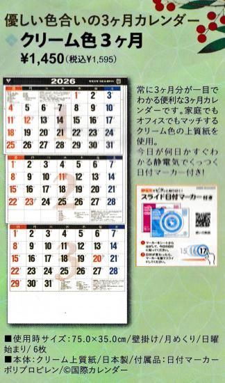 常に3ヶ月分が一目でわかる便利な3ヶ月カレンダーです。家庭でもオフィスでもマッチするクリーム色の上質紙を使用。